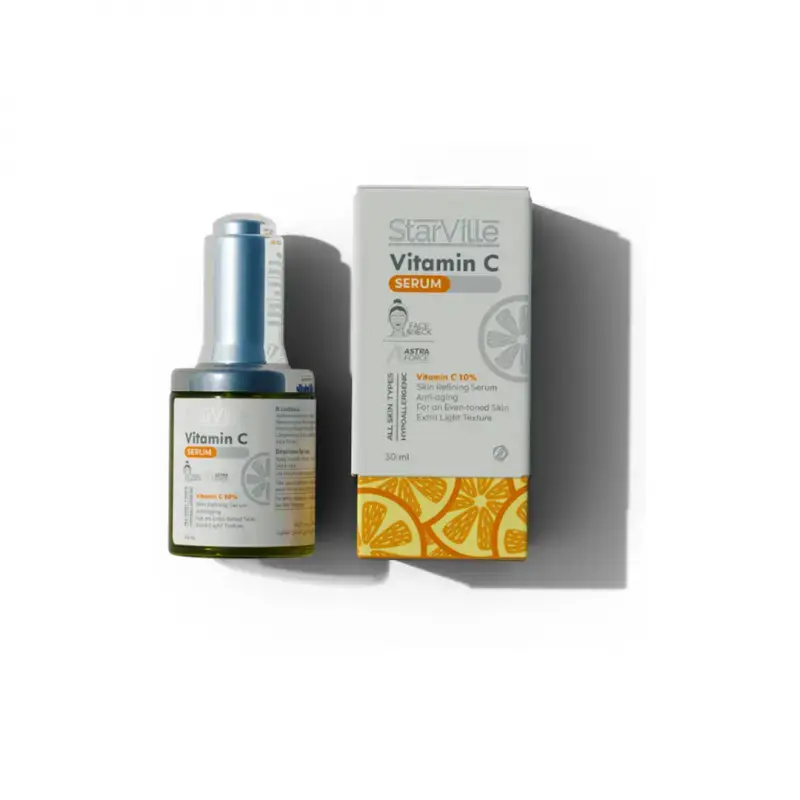 ستارفيل فيتامين سي سيروم يعزز حيويه و نضارة البشرة . • مضاد للتجاعيد و يساعد في محو الخطوط الدقيقه. • مضاد للاكسدة و يعمل علي توحيد لون البشرة. •يعزز اختفاء البقع الداكنه و يمنع ظهورها مرة اخري. • يثري جلدك بالفيتامينات الاساسية اللازمة لبشرة صحية متوهجة. طريقة الاستخدام: يستخدم ستارفيل فيتامين سي سيروم ليلا علي الوجه و الرقبة استخدام اطراف الاصابع لتدليك بلطف طبقة رقيقة علي المناطق المطلوبة تجنبي منطقه محيط العين اثناء استخدام ستارفيل فيتامين سي سيروم ضعي مرطبك اليومي المناسب بعد بضع دقائق